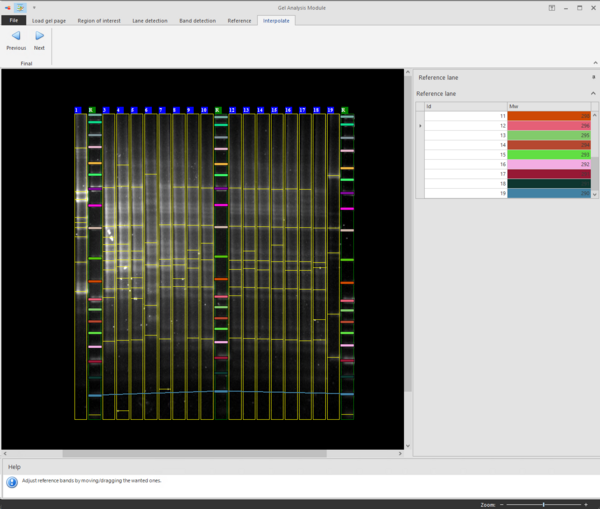 Check if the reference bands of one color are having equal molecular weights (approximately). If this is not the case, then drag and drop the colored parts in the lanes up and down. When a band is missing or an unwanted band is visible, go back to step 4 Band detection and modify the bands.