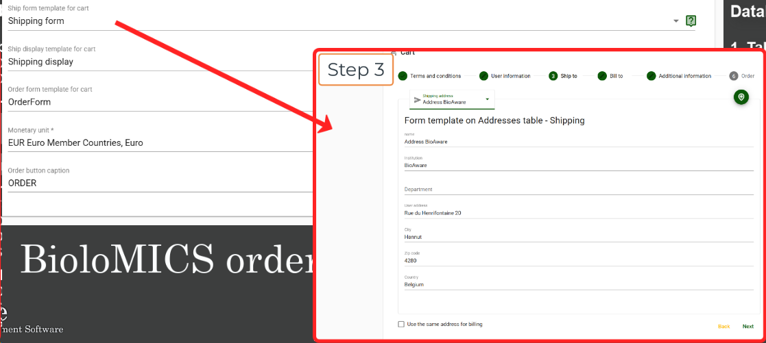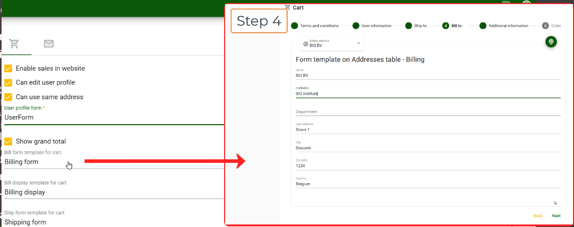 Bill form template for cart Select the form template which contains the fields for billing information.