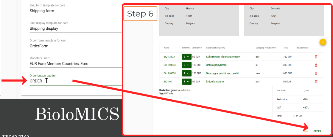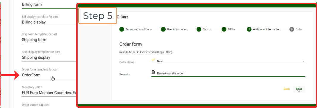 Order form template for cart In the cart checkout, a form can be integrated as an additional step (step 5) to provide extra information about the order.